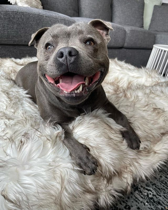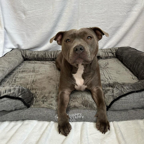 myla.thebluestaffy My lovely new calming day bed🤍 thankyou so much @happystaffyco Feels like a dream, I am one lucky pup!